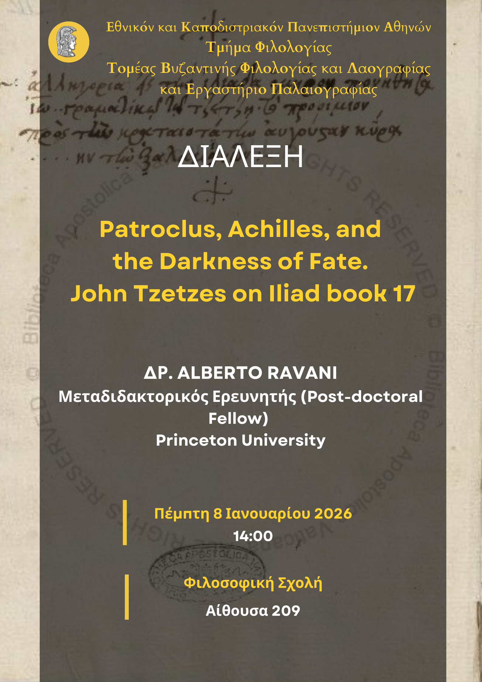Ο Τομέας Βυζαντινής Φιλολογίας και Λαογραφίας και το Εργαστήριο Παλαιογραφίας σας προσκαλεί στη διάλεξη του Δρ. Alberto Ravani (Μεταδιδακτορικού Ερευνητή, Princeton University) με τίτλο Patroclus, Achilles, and the Darkness of Fate. John Tzetzes on Iliad book 17.